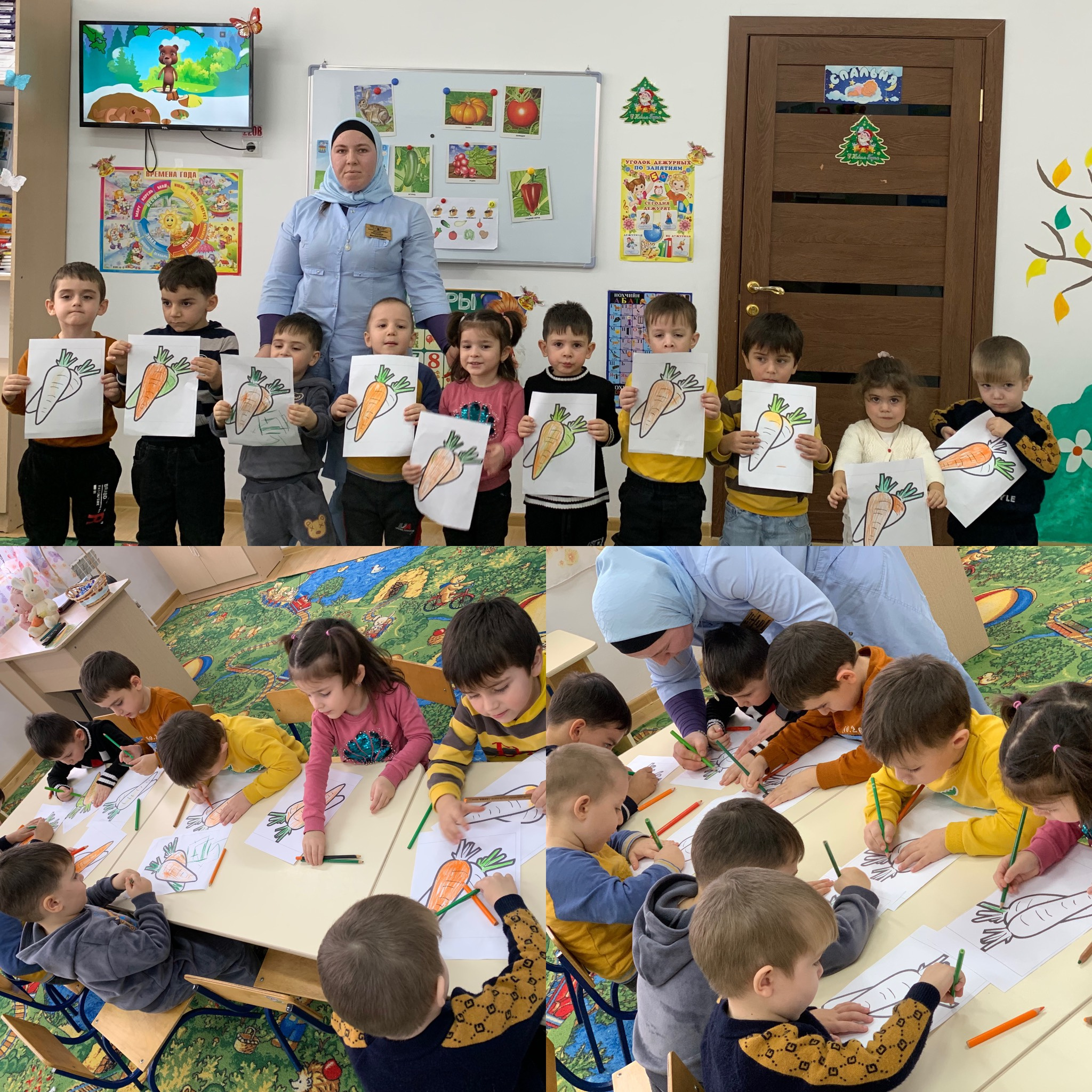 Цель:закреплять умение рисовать морковку,различать цвета.